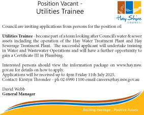 Hay Shire Council Council are inviting applications from persons for the position of: Utilities Trainee.
