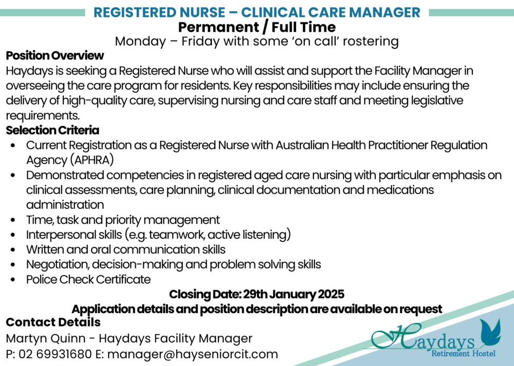 Haydays is seeking a registered nurse who will assist and support the facility manager