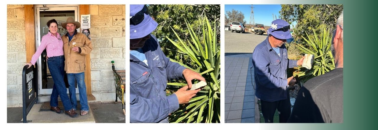 Above from left: Sarah Ker and Matt Young, mine hosts from White Cliffs Hotel, and Rusty from Southern Cross Opals, with his 100 million year old opalised wood