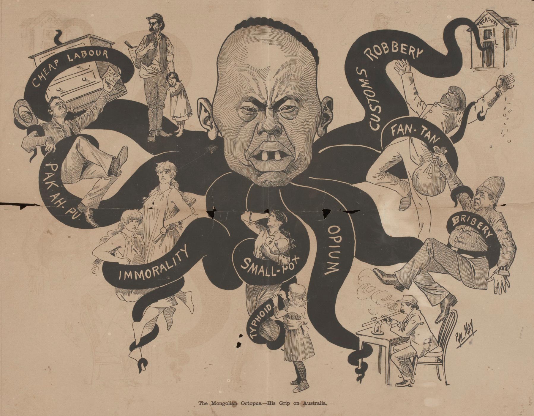 The Bulletin, 21 August 1886. The image shows the head of a person depicted as an octopus with eight tentacles. Each tentacle is holding a person or object with text written on each tentacle.It details depositions taken at a magisterial inquiry held by R.B. Mitchell, Esq., P.M. at Wyndowinal Station, on Sunday, June 27 1875, concerning the death of George Adams, who died at that station the night before.