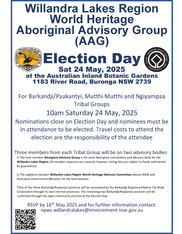 The 2025 election for Aboriginal representatives on the Willandra Lakes Heritage Region advisory group will be held in May.