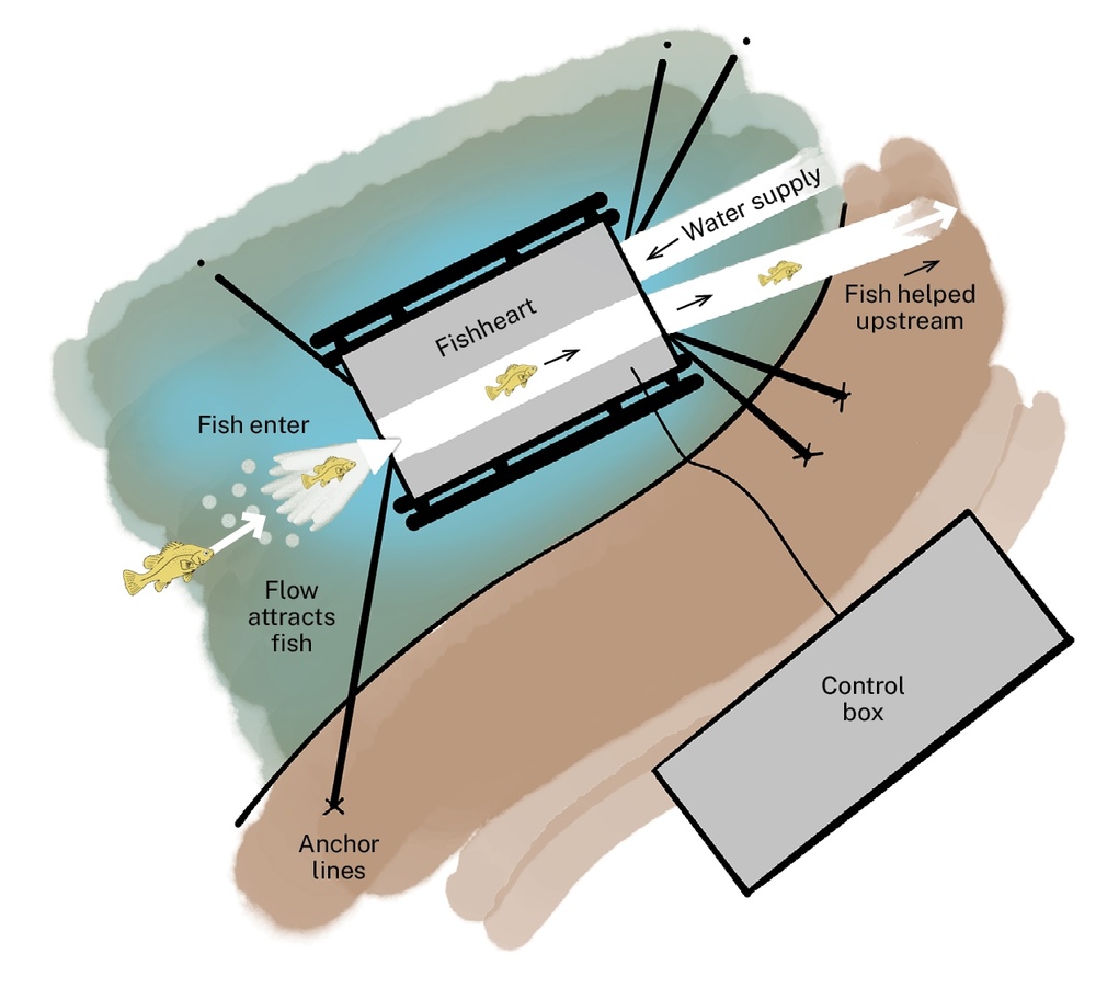 Making the art gave everyone involved the time, space and tools to consider and discuss the project. We learned how the Fishheart technology is inspired by the human heart, with tubes resembling “veins” and “arteries” that can take fish in and “pump” them over barriers through a siphon effect, letting them circulate throughout the river.