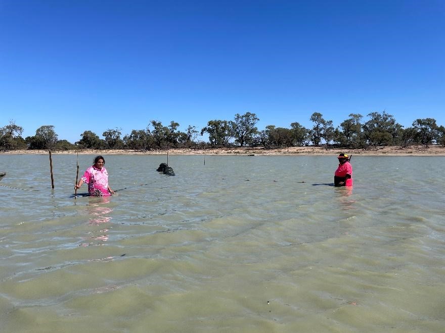 Field team members Jedda Kelly and Maxine Kelly setting fish nets at Tala Lake, late April 2025. Image: CSU