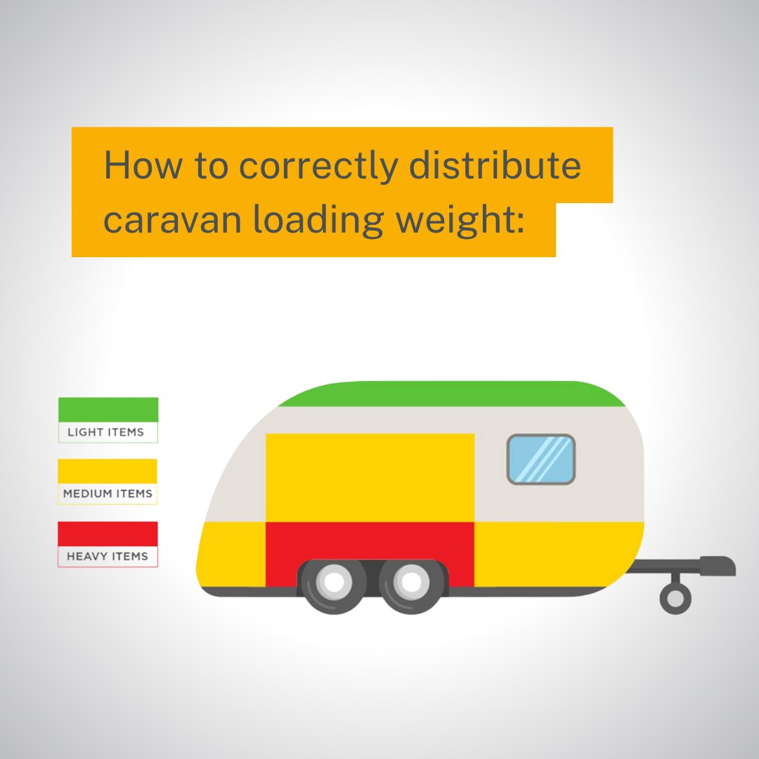 When loading your caravan, make sure that the heaviest items are packed low and centred over the caravan’s wheel axles and the lightest items are packed up high and distributed across the vehicle.