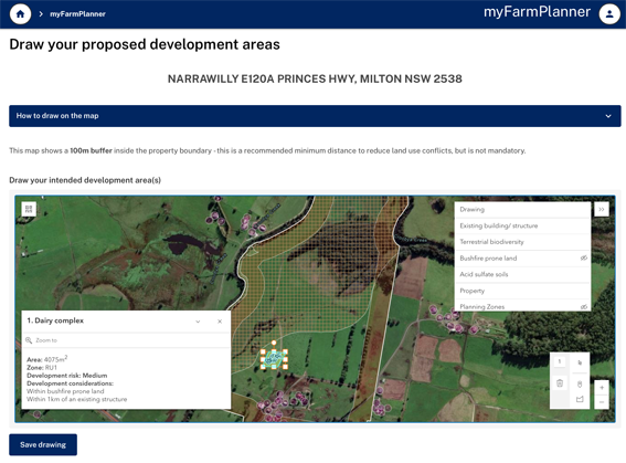 myFarmPlanner provides farmers with all the information they need to know to lodge a development application in as little as 15 minutes using a tailored questionnaire and interactive map.