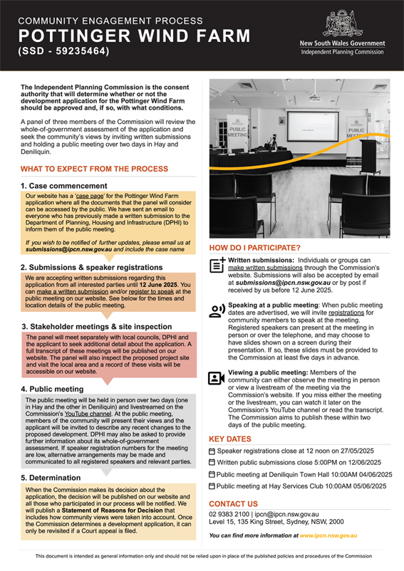 The community will be able to have its say at a public meeting on the Pottinger Wind Farm, a State significant development application (SSD-59235464) by Someva Renewables and AGL Energy to develop a 1,300 megawatt (MW) wind farm comprising 247 wind turbines, a 500 MW battery energy storage system and associated infrastructure.