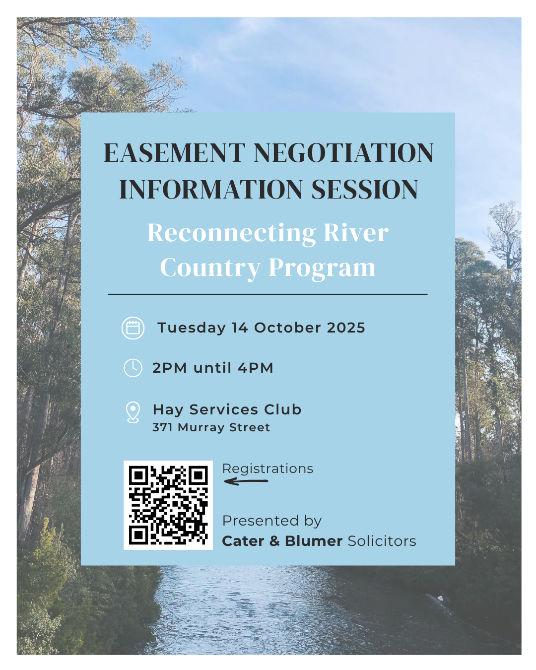 “To assist landowners, we’re holding an Easement Negotiation Information Session at 2 pm, Tuesday 14 October 2025 at the Hay Services Club at 371 Murray Street, Hay.