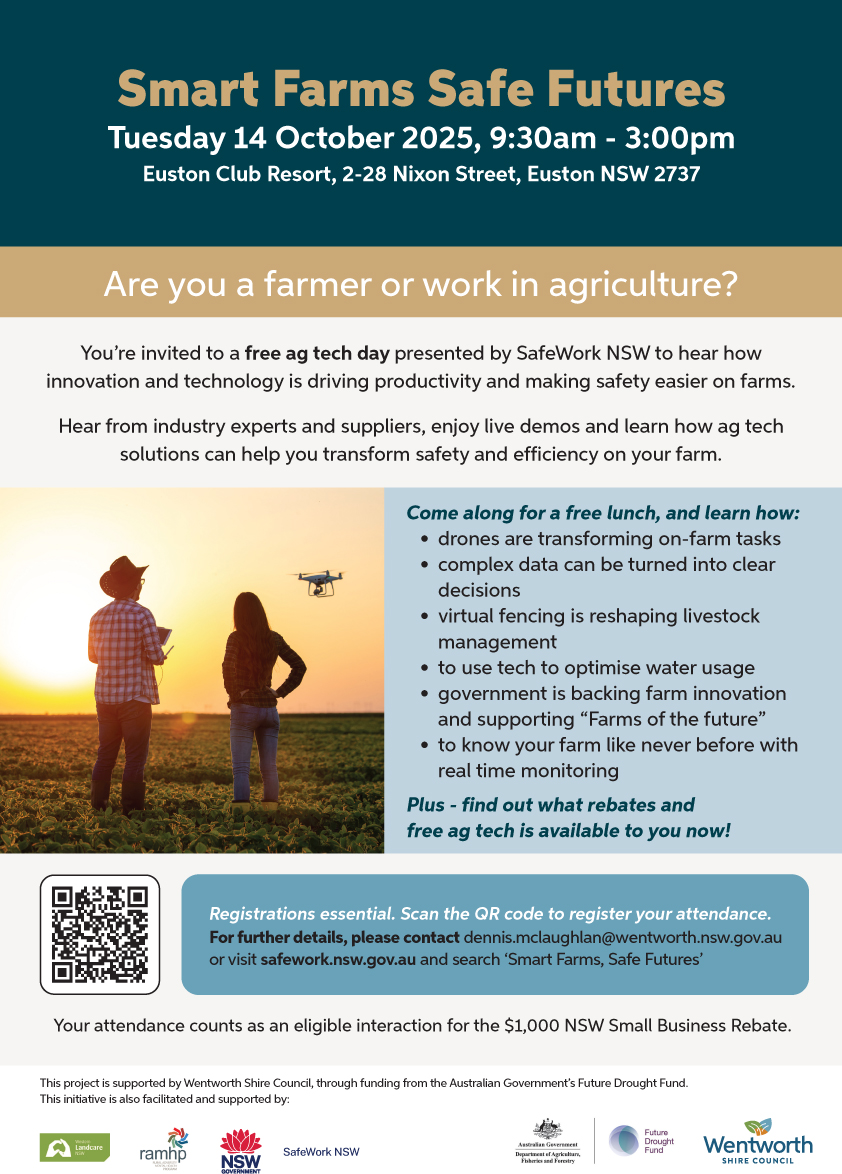 The "Smart Farms Safe Futures" Ag Tech Day, presented by SafeWork NSW, is scheduled for Tuesday 14 October 2025, running from 9:30 am to 3:00 pm.