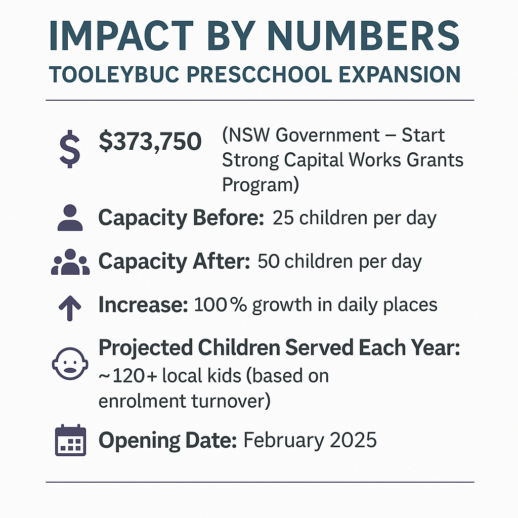 The $373,750 NSW Government investment through the Start Strong Capital Works Grants Program has enabled Tooleybuc Preschool to expand from accommodating 25 children daily to 50, addressing long-standing waiting lists and accessibility challenges faced by families in the region.