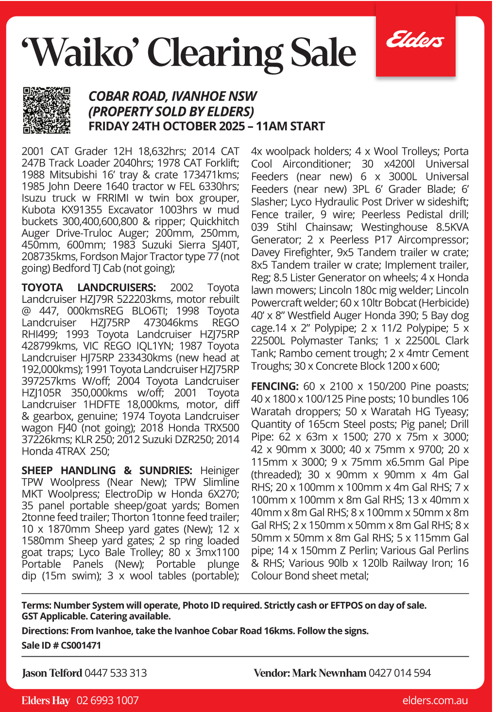 The sale includes heavy machinery, motor vehicle, sheep and shearing equipment, tools and fencing supplies.